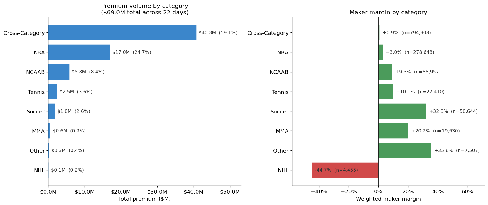 On March 12th, I decided to spend my day going through twenty-two days of Kalshi combo parlay data, over 1.28 million executed trades and $69 million in premium, trying to understand what kind of business Kalshi has been cooking up. In these twenty-two days, market-makers on Kalshi’s combo book collected $2.44 million in net margin against $69 million in premium.