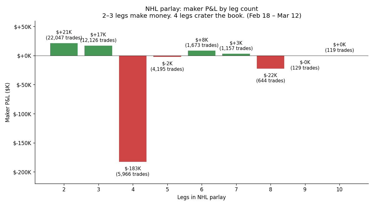 Almost every single sport category was profitable for market-makers across those twenty-two days we investigated, except for NHL parlays, which cost the makers roughly 9% of their premium. As I was looking into the data, I found that most NHL parlays were profitable for makers, except for four-leg parlays. Four-leg parlays were running a NUTTY -96% margin on $191,000 of premium.