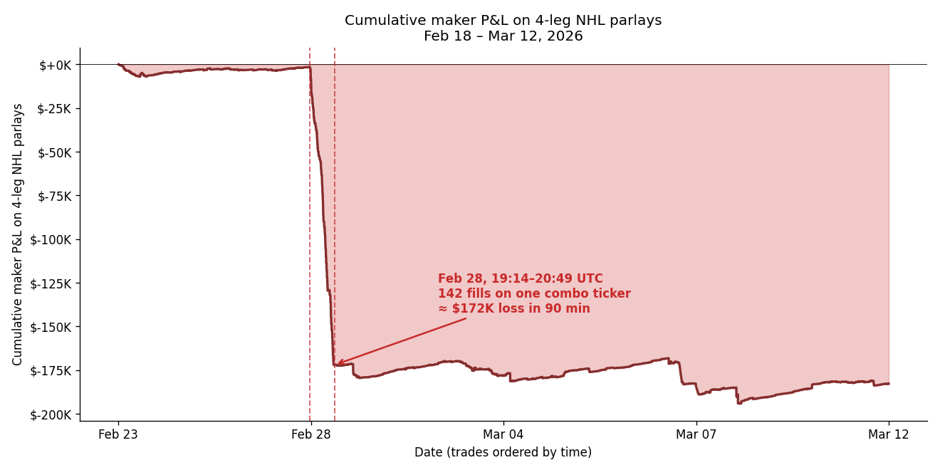 This ticker traded for only ninety-five minutes. It opened for fills on Saturday, February 28, 2026 at about 2:14 PM on the Eastern seaboard. And in the ninety-five minutes of its lifetime, it took 142 fills. The fills landed in sizes between thirty-nine and seven hundred twenty contracts, almost all of them at a price of ten to fifteen cents per contract, with 90 of the 142 at ten cents exactly. When the ticker’s games finished on the following Monday night, the combo paid out $1.00 per contract for 201,921 contracts. The maker had collected $25,530 in premium. The maker paid out $201,921.