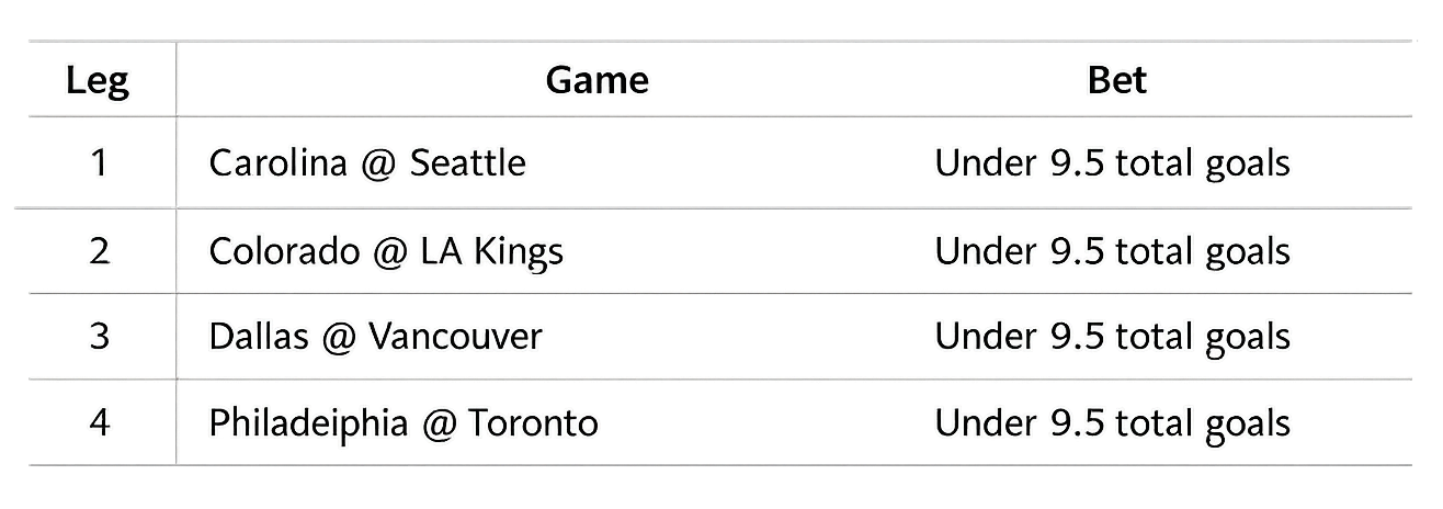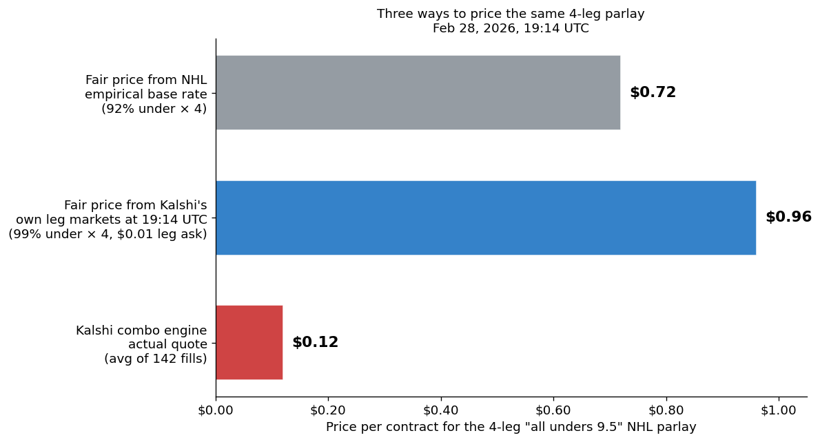 The NHL averages about 6.2 combined goals per game, so 9.5 is a ridiculously high line. By rough league base rate, each “under 9.5” happens something like 90% of the time. Four of them on the same night, assuming independence, comes out to `0.90⁴ = 0.66`. Even accounting for correlation goal totals on a given night move together for all sorts of mundane reasons, from officiating style to post-Olympic conditioning to how often teams are playing on the second night of a back-to-back, the fair combo price was probably a little higher than that, so maybe $0.70-$0.85.